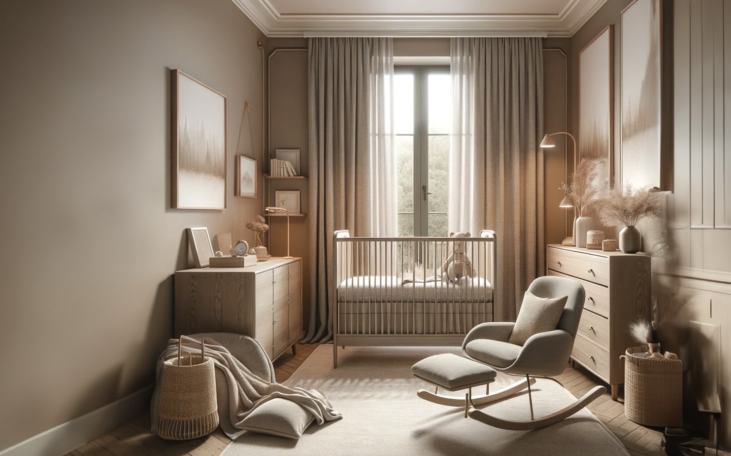 Deze taupe babykamer maakt slim gebruik van natuurlijke materialen, zoals hout en katoen om het aardse gevoel in de kamer te versterken. Ze zijn niet alleen duurzaam maar voegen ook textuur en warmte toe aan de ruimte.