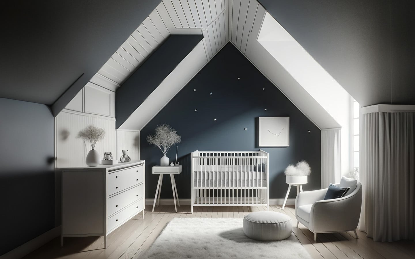 Deze blauwe babykamer combineert moderne elegantie met een speels karakter. Het schuine dak geeft een unieke touch, terwijl de overwegend witte tinten zorgen voor een heldere, rustige sfeer. De donkerblauwe muur creëert een opvallend contrast, wat een stijlvolle diepte aan de kamer geeft.