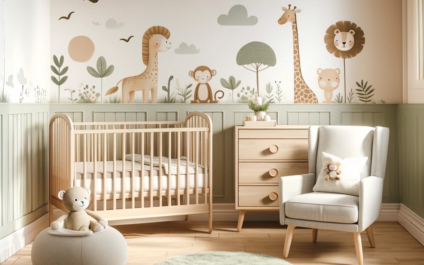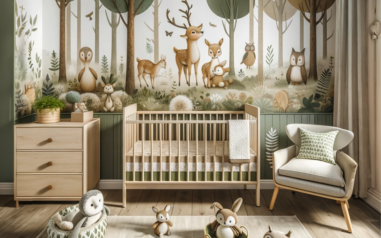 Deze bosdieren babykamer is het thema dat een betoverende sfeer creëert. Een muurschildering van een rustige bosscène met vriendelijke cartoon bosdieren zoals herten, konijnen en uilen voegt een vrolijke noot toe.