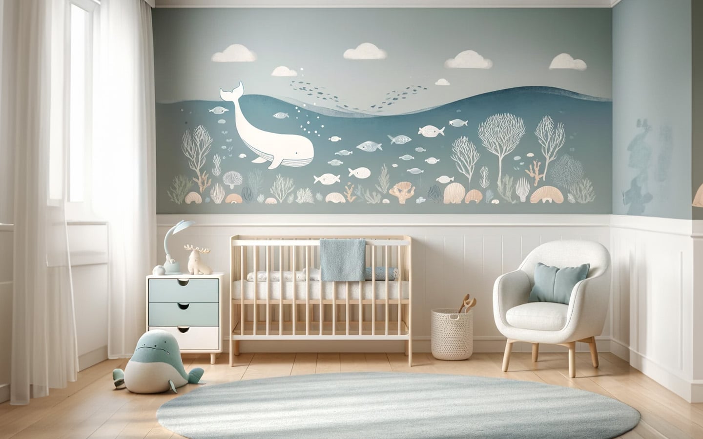 Een eenvoudige muurschildering toont enkele oceaandieren, zoals een vriendelijke walvis en een school van vissen. Het minimalistische meubilair houdt de ruimte overzichtelijk.