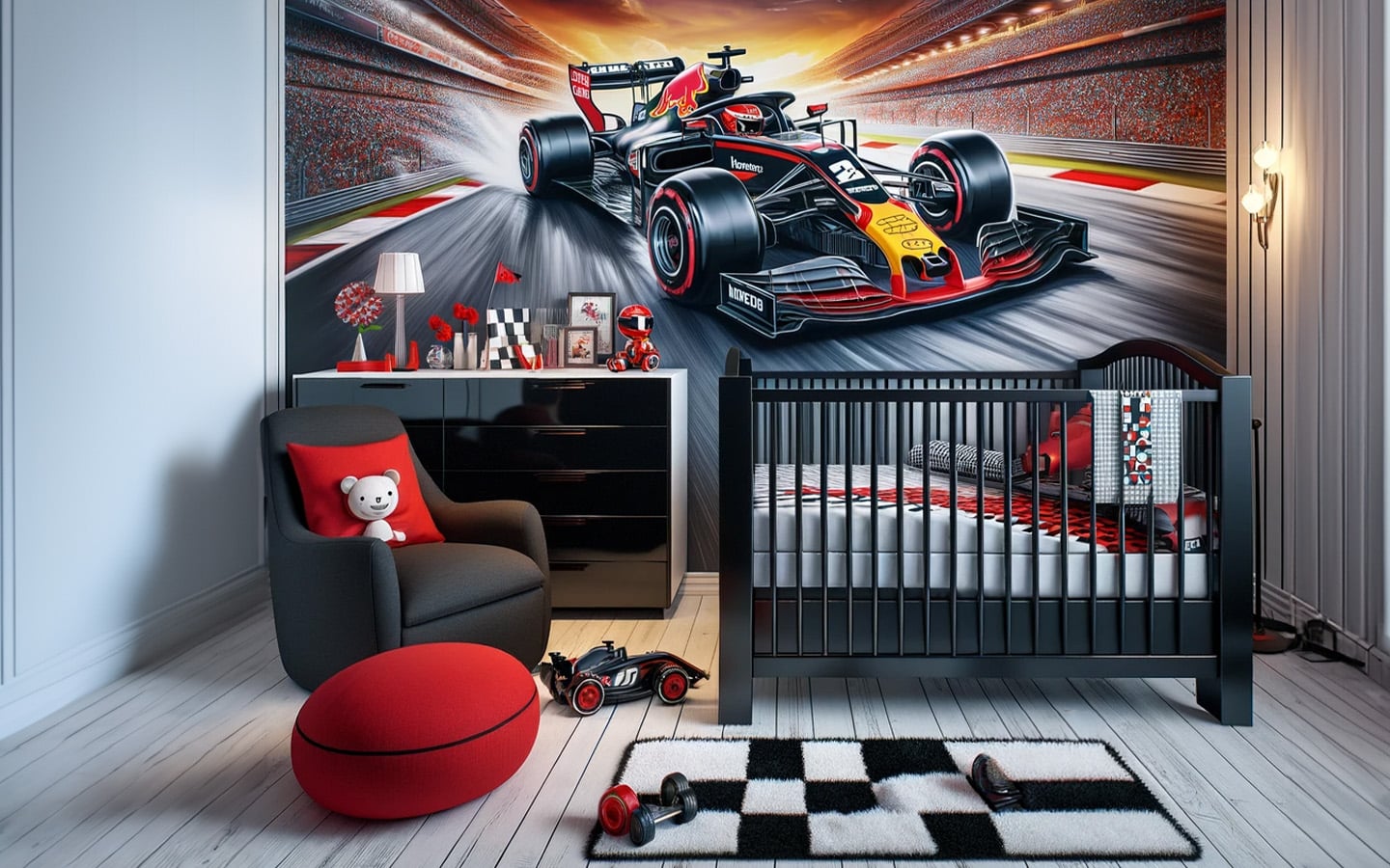 Fan van de formule 1? Dan is deze babykamer echt is voor jouw kleintje. Deze kamer is geïnspireerd door de Formule 1 en brengt de spanning van de racebaan naar de slaapkamer. Een levendige muurschildering van een Formule 1 racebaan met racende auto’s vormt de achtergrond.