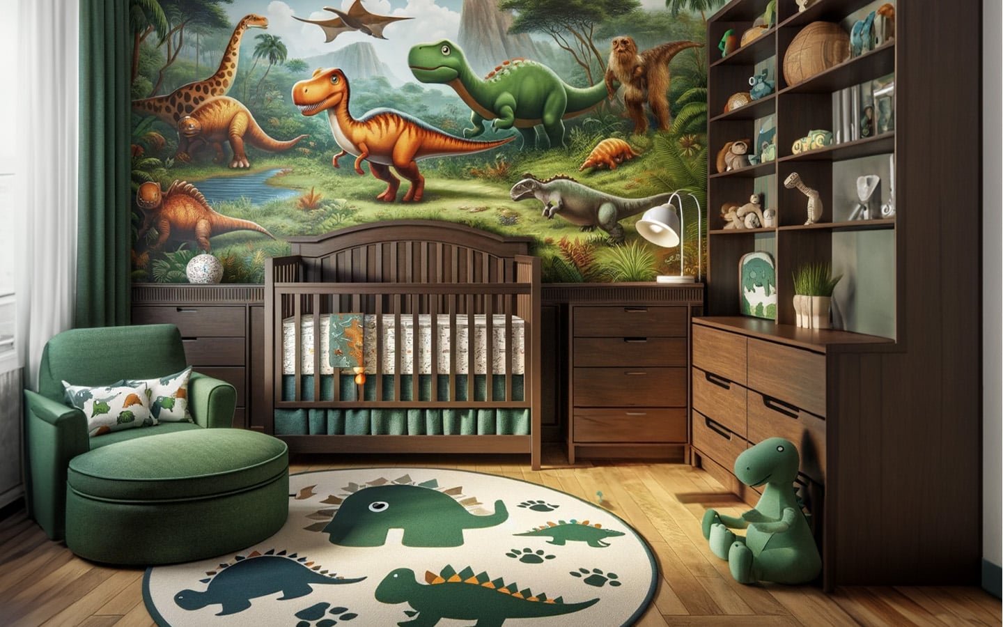 Het beddengoed en zachte knuffels verhogen het avontuurlijke karakter. Een comfortabele groene leunstoel en een rond vloerkleed met dinosauriërs maken de kamer zowel avontuurlijk als geruststellend.