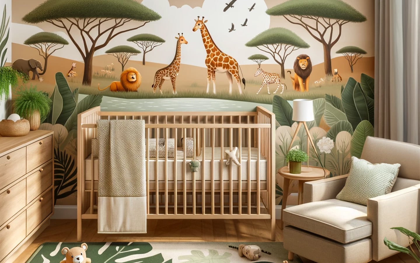 Houd jij van de safari en wil je dit thema graag in de deze kamer terug laten komen? Met het safari thema neem je jouw kleintje mee op een avontuur in de Afrikaanse savanne. De muurschildering toont een vredige savanne omgeving met cartoon dieren zoals giraffen, olifanten en leeuwen.